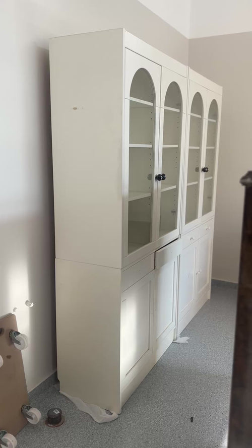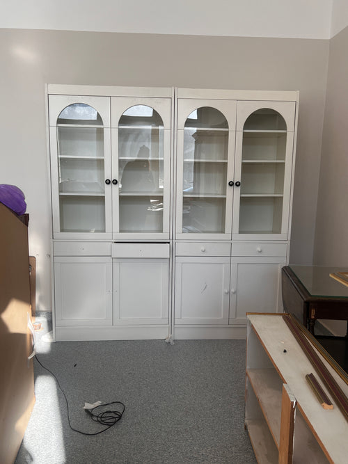 Tallrikshylleskåpet är ett återbrukat skåp som fått nytt liv med två sektioner med tallrikshylla och skålhandtag. Målat i Jotuns kulör Gentle Whisper i matt finish har skåpet fått ett mjukt och lugnt uttryck som passar fint i många olika hem.